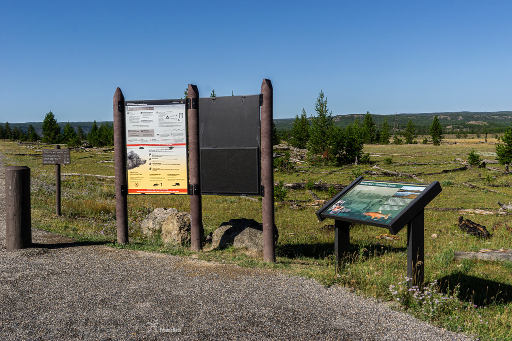 The trail went through a forest of Lodgepole Pines that all were pretty young and started to grow after the 1988 fires. It's definitely nice to see all the regrowth. s soon as I turned on Fountain Flats Road and to the viewpoint, I was busy like crazy. Definitely not my type of hike. So I just stopped for a quick shot and escaped the circus as soon as I could.